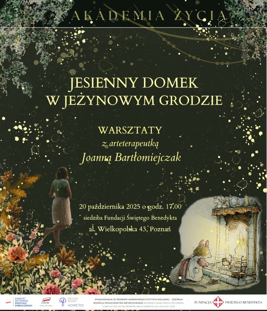 Centrum Kultury Fundacji św. Benedykta zaprasza na warsztaty dla dzieci (4-8 lat) pt. „Jesienny domek w Jeżynowym Grodzie”, które poprowadzi arteterapeutka Joanna Bartłomiejczak. Wydarzenie odbędzie się 20 października o 17:00. Wstęp wolny, obowiązują zapisy [formularz poniżej].