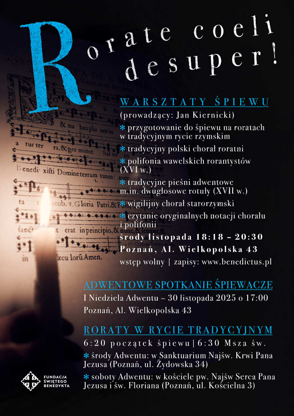 Już niedługo Adwent, a co za tym idzie – w Poznaniu roraty w tradycyjnym rycie rzymskim. Wszystkie dobrze śpiewające osoby chcące włączyć się w śpiew liturgiczny zapraszamy do rejestracji na cykl czterech warsztatów przygotowujących do śpiewu na roratach, a wszystkich chcących śpiewać z kościelnych ław – na adwentowe spotkanie śpiewacze.